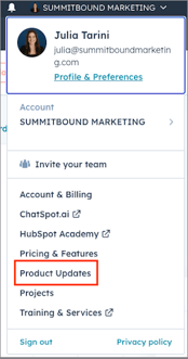 To navigate to the Product Updates page, simply click on your account dropdown in the top right and click “Product Updates”.